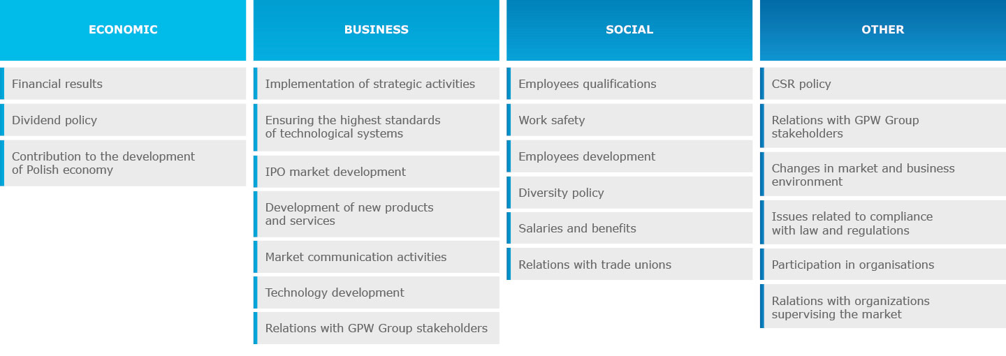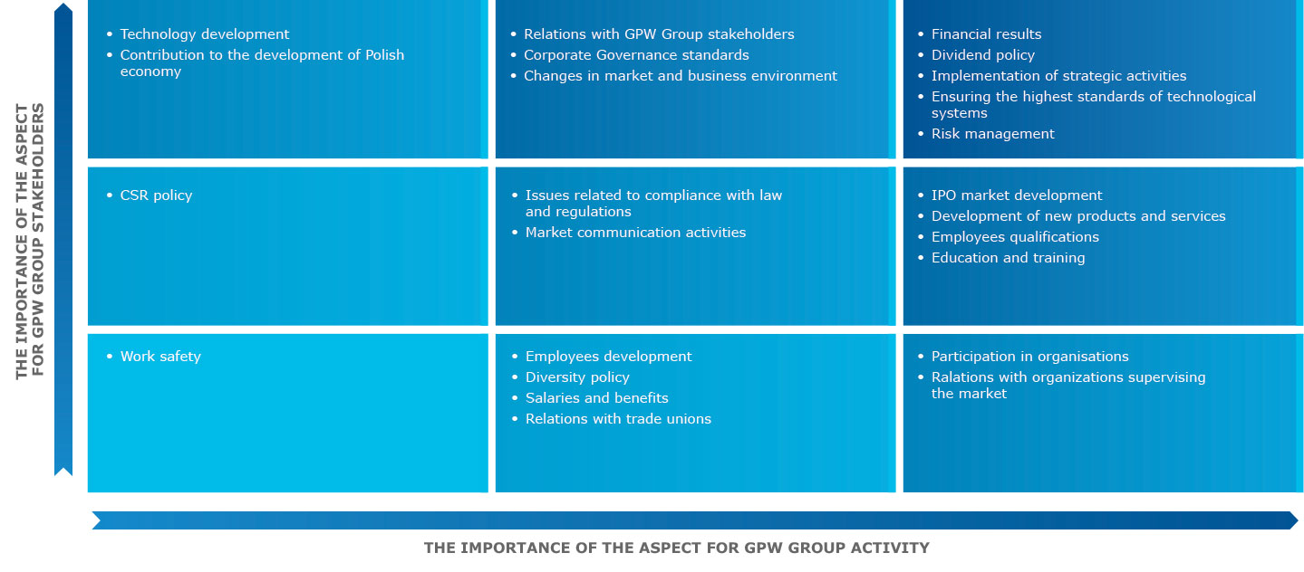 The materiality determination process, which involves: identifying relevant matters, evaluating the importance of relevant matters, prioritising the matters, and determining the information to disclose about material matters, took place as a structured internal consultation of the GPW Group Management and senior managers. It produced a materiality matrix and a map of key factors of relevance to the stakeholders. Those include all financial and non-financial aspects affecting value creation in the GPW Group.